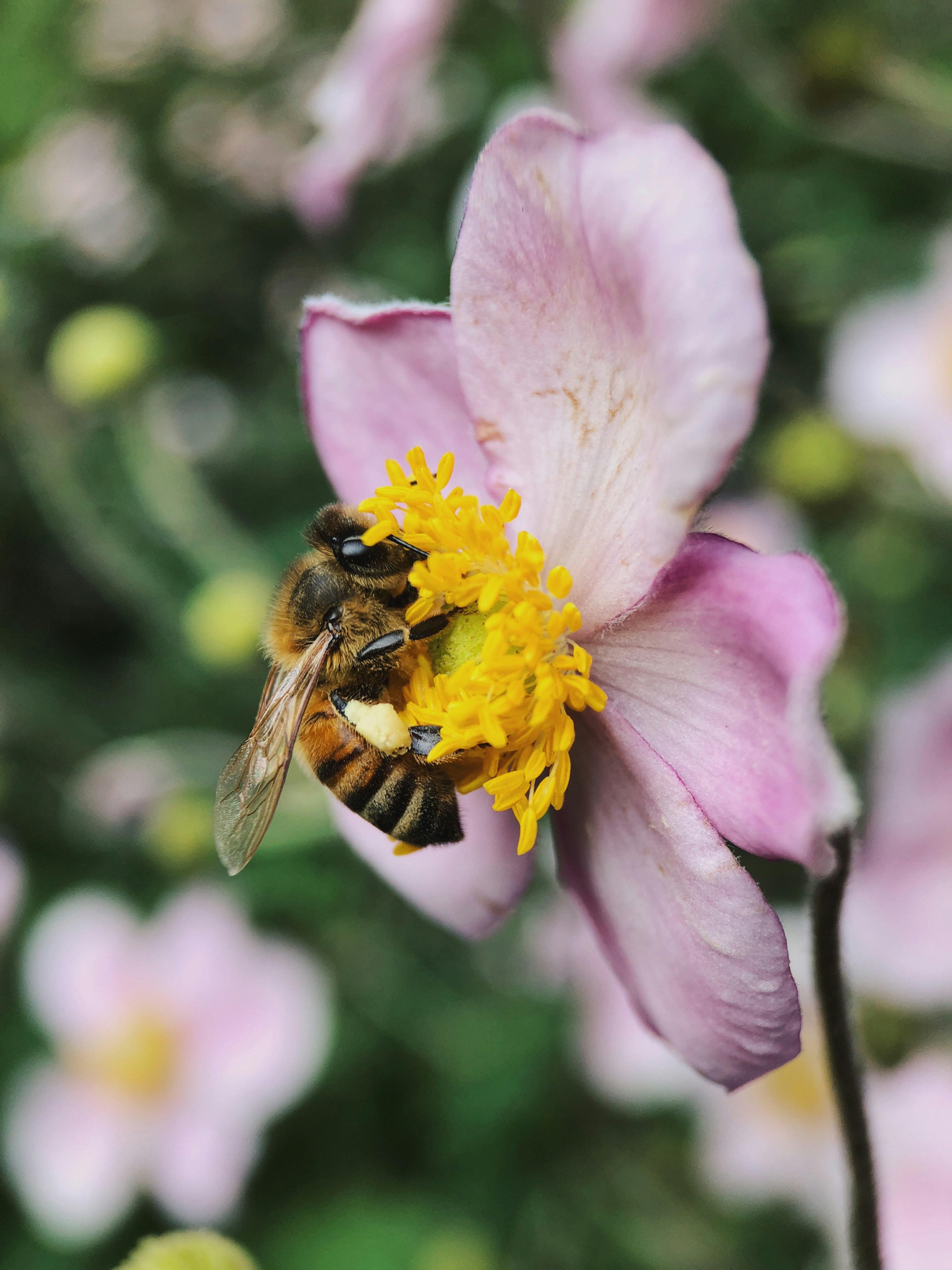 The most important task of a worker honeybee is pollination. Through her last stages in life, she will fly out in search of flowers that are filled with nectar. She then uses her ultra violet vision to discover flowers that have the most nectar. Next she will land on her favorite flower, and drink the nectar from that flower, which she stores in her honey sack, and her special enzymes will start to transform it into honey. As she drinks from the flower, she is also collecting the pollen from that flower, and it sticks to all of the little hairs on her body. When she is done at that flower, she will then move to a next one, and the pollen from the first flower will brush off of her body on to the new flower. This process is pollination, and it fertilizes the plants to help them produce healthily.
